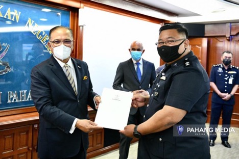 Turut hadir, Pengarah Jabatan Siasatan Jenayah (JSJ) Bukit Aman, YH. Dato’ Sri Abd Jalil Hassan; dan Ketua Polis Pahang, YDH CP Datuk Ramli Mohamed Yoosuf.