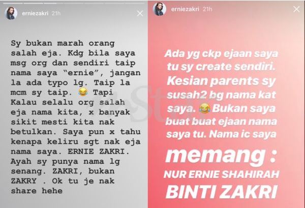 “Ejaan nama saya ialah Nur Ernie Shahirah Zakri,” katanya.