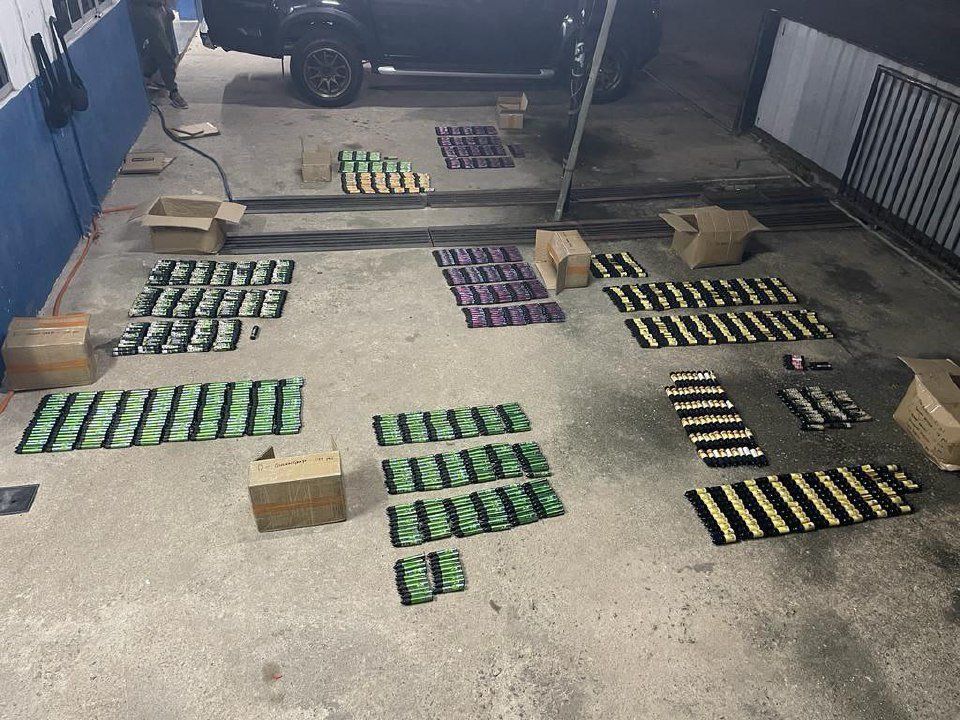 RANTAU PANJANG: Polis merampas 1,608 botol perisa vape pelbagai jenama bernilai RM192,960 di pangkalan haram Tebu, di sini, jam 1.45 petang semalam.