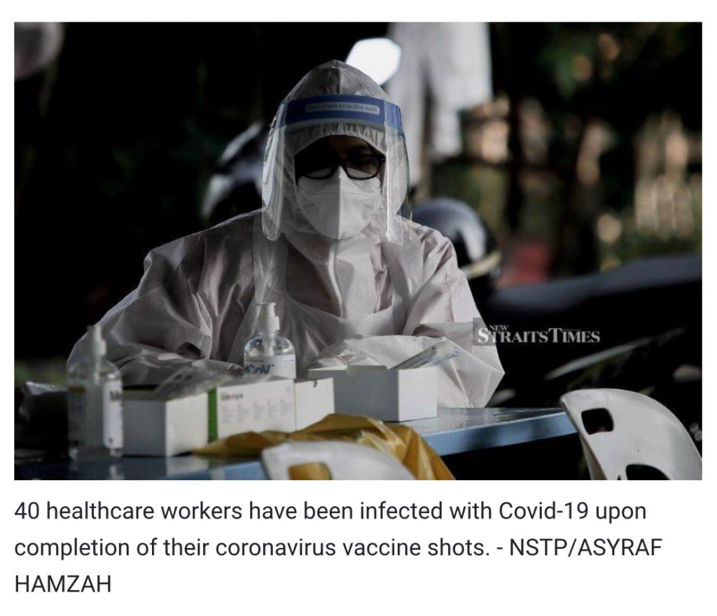 In a Facebook post, Health director-general Tan Sri Dr Noor Hisham Abdullah said of the total, 31 healthcare workers were infected less than two weeks of the second dose of inoculation, while another nine were infected more than two weeks after the second dose.