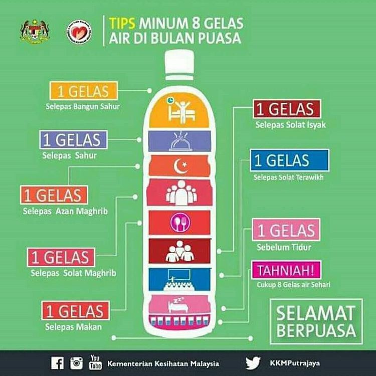 Mengikut saranan KKM, anda sepatutnya boleh mencukupkan 8 gelas air sehari dengan jadual minum air seperti berikut: