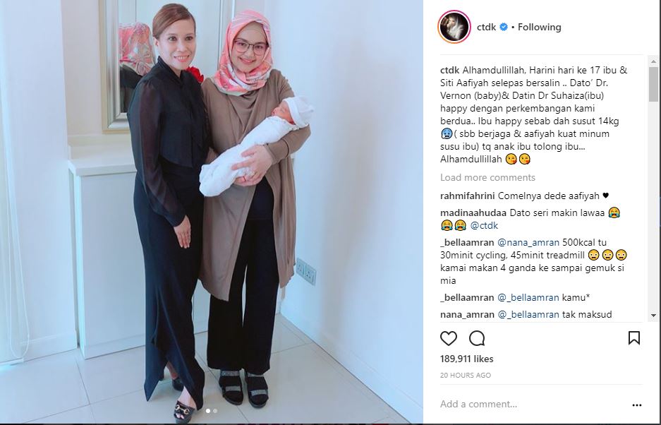 Gara-gara Aafiyah kuat menyusu dan kerap berjaga malam, berat badan Datuk Siti Nurhaliza susut 14kg selepas 17 hari bersalin.