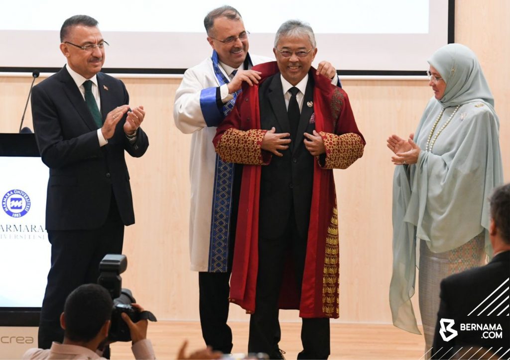 Ijazah Kedoktoran Kehormat itu disampaikan oleh Rektor Universiti Marmara Profesor Dr Mustafa Kurt berdasarkan sumbangan Seri Paduka dalam memelihara keamanan sejagat serta memperkukuh hubungan Turkiye dan Malaysia dalam satu majlis di universiti berkenaan di sini.