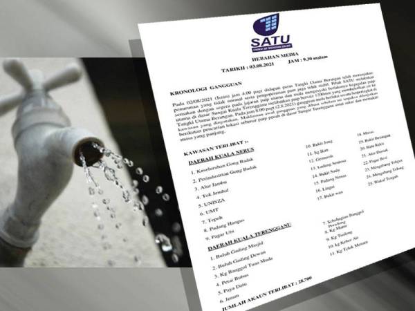 “Bagi memastikan penduduk mendapat bekalan air sehingga proses pembaikian siap, SATU telah menggerakkan sebanyak lapan buah lori tangki yang diagihkan oleh Jabatan Bomba dan Penyelamat Malaysia (JBPM) Kuala Terengganu dan Syarikat Pengurusan Air Pahang (PAIP) kepada penduduk,” menurut kenyataan itu.