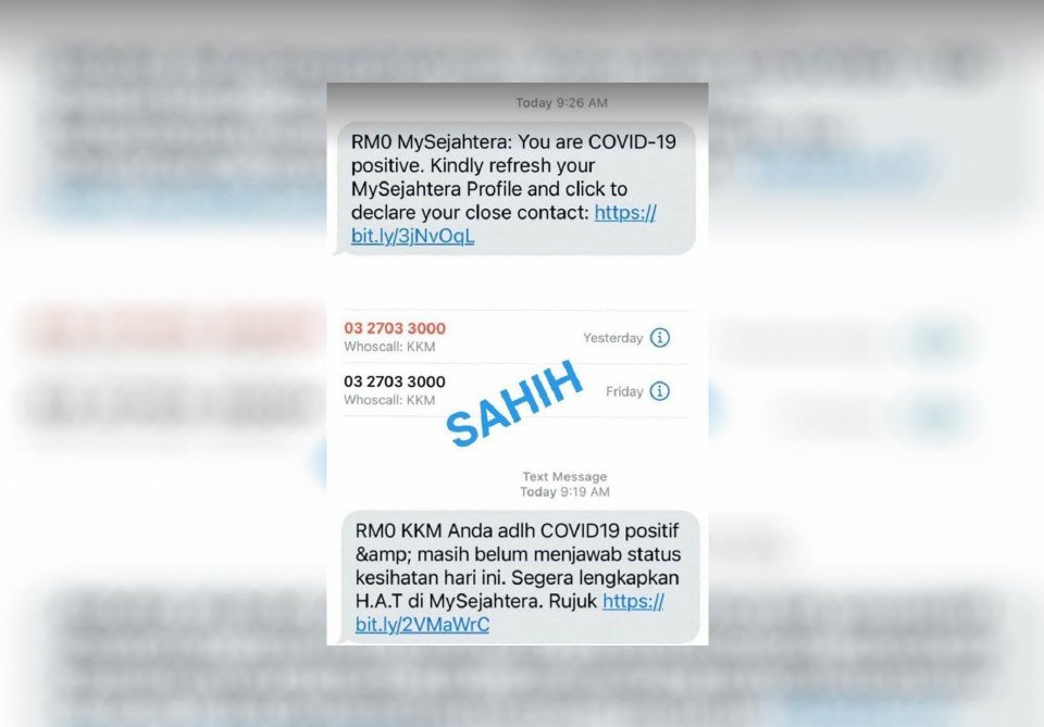 “Mesej ini adalah sahih. KKM sedang menghubungi kes COVID-19 melalui panggilan telefon 03-2703 3000 dan melalui SMS untuk mengingatkan mereka supaya mengisi Penilaian Kendiri (HAT) dalam MySejahtera bagi pemantauan CAC Maya,” kongsi beliau.