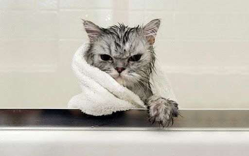 Jangan sesekali merendam seluruh badan kucing ke dalam singki atau baldi yang penuh dengan air kerana ia boleh membuatkan kucing tertekan.