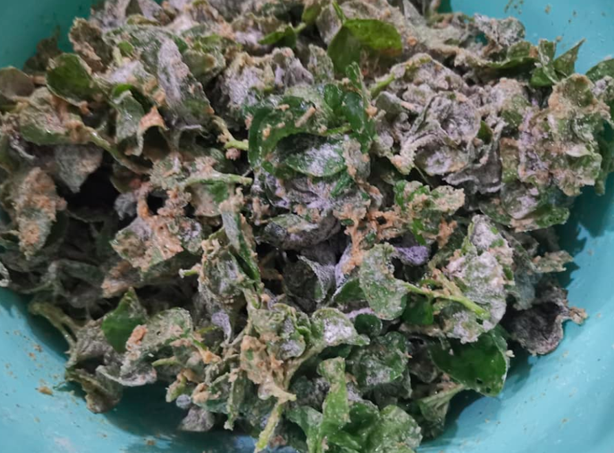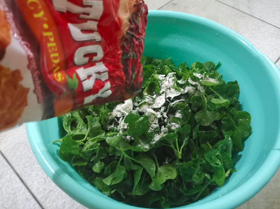 3. Gaul dengan tepung Kentucky atau tepung goreng ayam ala-ala KFC tu. Yang ni Sha guna tepung Kentucky jenama Nona Hot & Spicy. Gaul tepung sampai rasa elok melekat pada bayam Brazil tu.