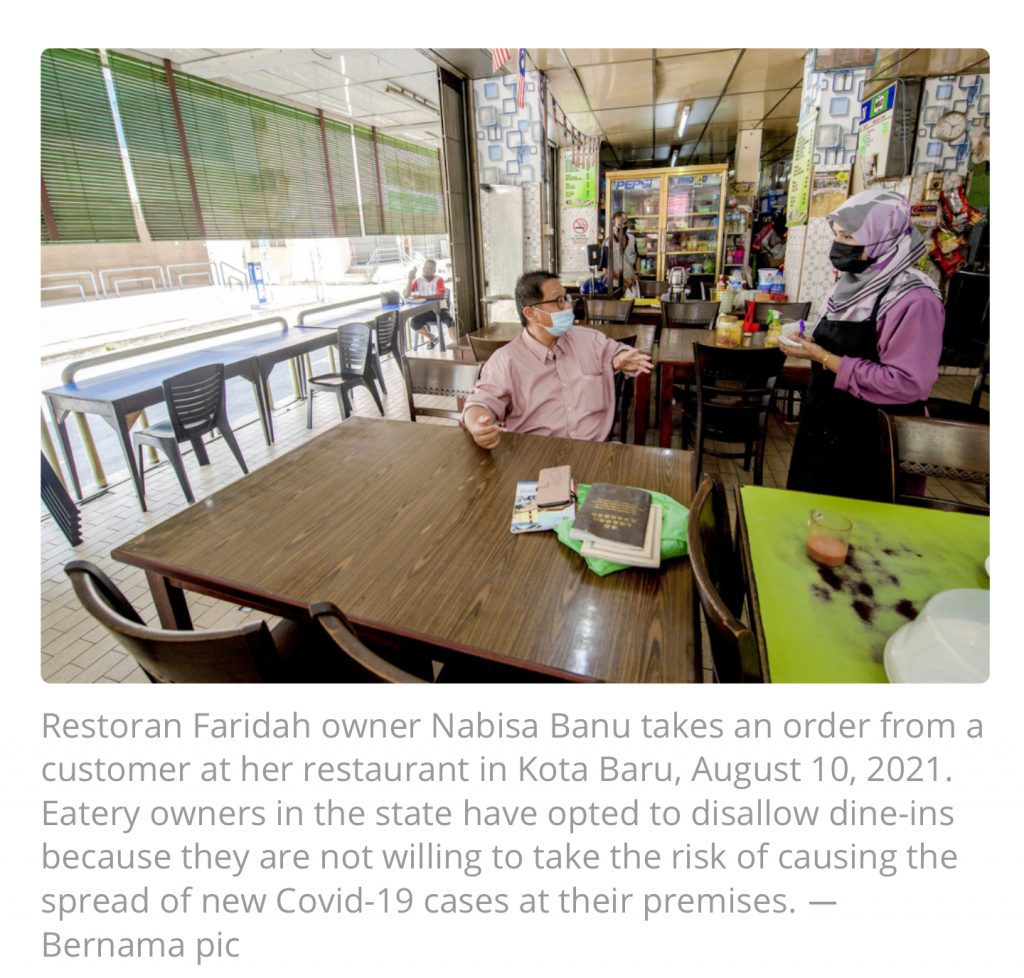 Lieniey Nasi Kerabu Tumis owner Zaini Ahmad, 51, said he did not allow dine-ins at his eatery because the daily Covid-19 cases in the state were still high and unsettling.
