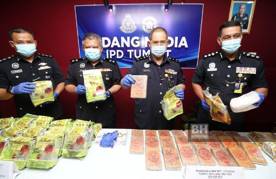 Tumpat: Polis merampas 36 kilogram (kg) syabu dan 8.4kg heroin base dengan nilai anggaran sebanyak RM2.1 juta di tebing Sungai Golok di Pulau Tengkorak di sini, kelmarin.