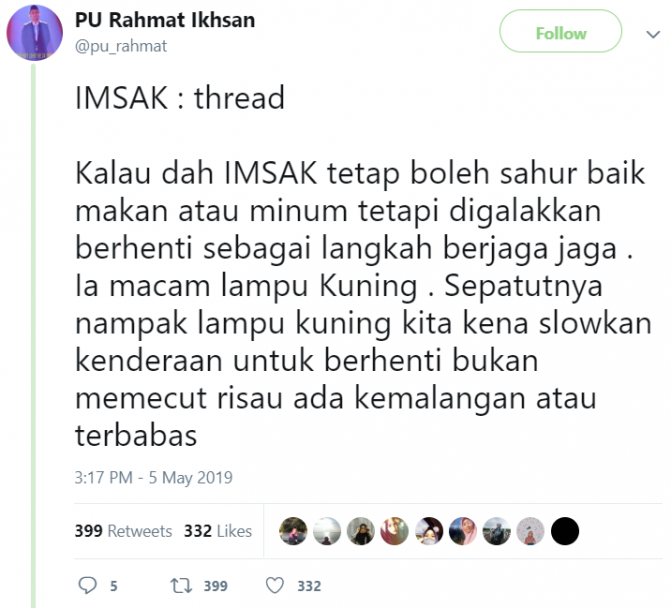 Menurutnya, waktu Imsak boleh diibaratkan seperti lampu isyarat berwarna kuning di mana kita perlu bersedia untuk memberhentikan kenderaan. Dengan ini, cara mudah untuk difahami ialah waktu Imsak kita disunatkan untuk berhenti makan dan waktu untuk kita berjaga-jaga kerana ianya menandakan waktu subuh bakal tiba.