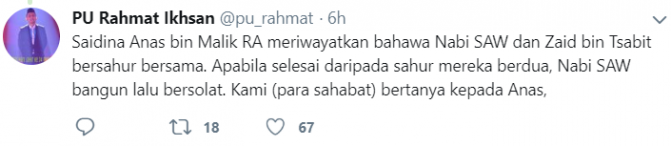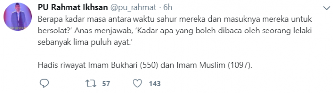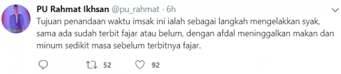 Dia turut menegaskan bahawa tujuan penandaan waktu Imsak adalah untuk mengelakkan syak sama ada sudah terbit fajar atau belum. Jadi lebih afdal untuk tidak makan dan minum sedikit sahaja sebelum terbit fajar.