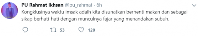 Ramai di antara kita yang keliru dengan tibanya waktu Imsak, adakah kita tidak dibenarkan makan terus ataupun sebaliknya. Menerusi Twitter PU Rahmat menerangkan tentang apa itu waktu Imsak dan adakah benar tidak boleh makan sekiranya waktu Imsak telah tiba. Hal ini turut diterangkan oleh Pejabat Mufti Wilayah Persekutuan melalui laman web rasminya.