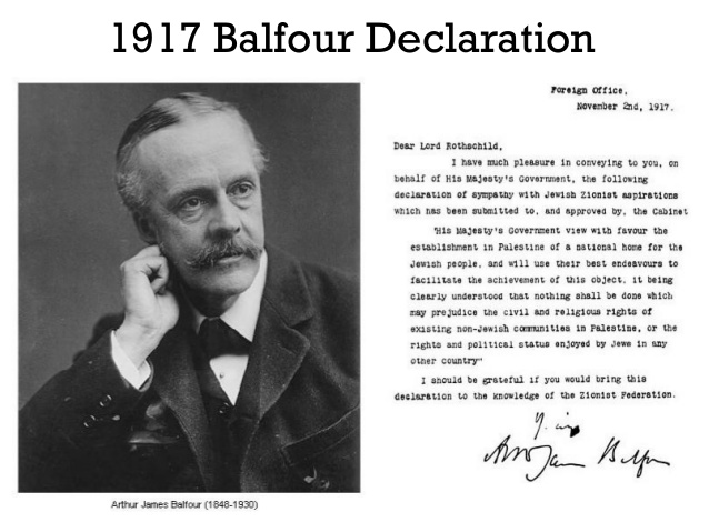 Pada 2 November 2017, Pihak British telah menyatakan simpati dan persetujuan mereka terhadap aspirasi Yahudi Zionis untuk menubuhkan sebuah negara baru di atas bumi Palestin. Pernyataan tersebut dihantar dalam bentuk sepucuk surat yang dikenali sebagai Deklarasi balfour. Deklarasi Balfour (1917) ialah satu surat dari Menteri Luar Britain yang bernama Arthur James Balfour kepada Lord Rothschild, pemimpin komuniti Yahudi Inggeris, untuk dikirimkan kepada Zionis. Deklarasi ini menjadi batu asas akan tertubuhnya negara Israel . Sebelumnya mereka cuba memujuk Sultan Abdul Hamid untuk menyerahkan Palestin kepada mereka, namun pujukan itu tidak berjaya meskipun tukarannya sangat berharga.