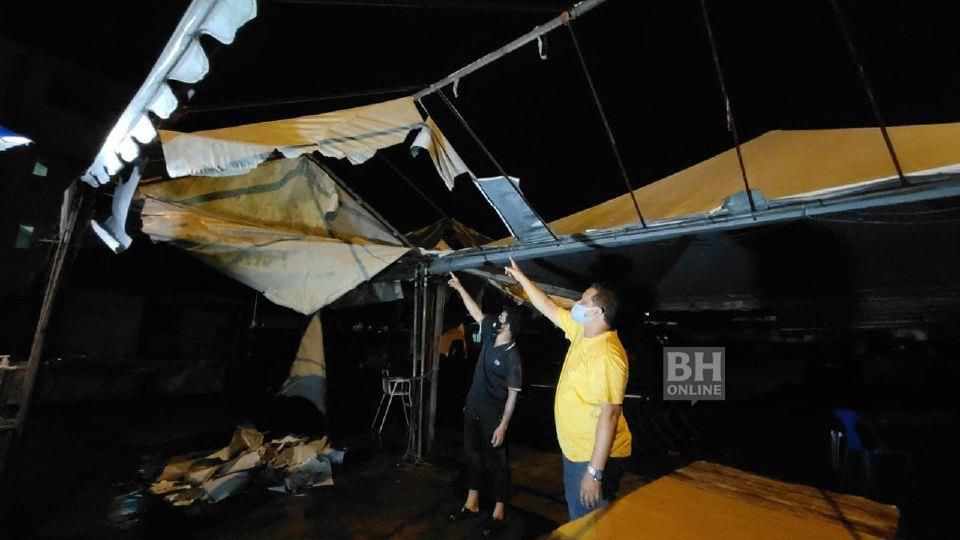 Tinjauan ke lokasi kejadian malam tadi, menunjukkan tiga gerai mengalami kerosakan teruk seperti khemah roboh, meja dan kerusi rosak, selain beberapa almari kaca pecah akibat kejadian berkenaan.