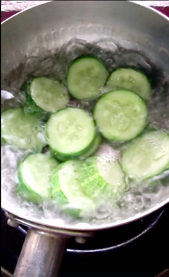 Potong-potong. Rebuskan dengan air sikit. Jangan lama sangat. Sebab timun ketegori sayur. Rebus lama nanti vitamin dia hilang. Agak lembut sikit boleh terus angkat. Sejukkan sekejap.