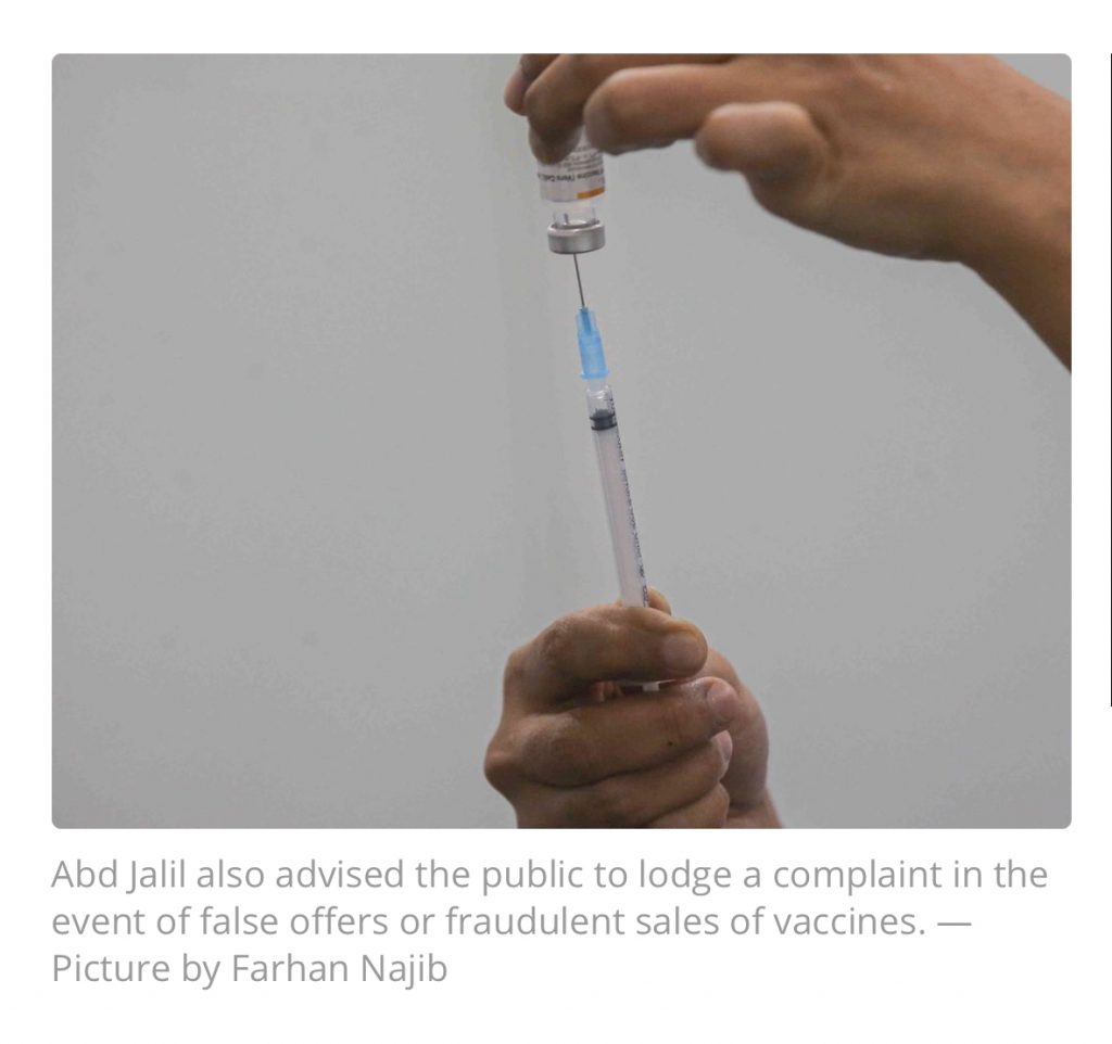 Abd Jalil also advised the public to lodge a complaint in the event of false offers or fraudulent sales of vaccines in the market and online as well as any sales efforts that are not in accordance with the National Covid-19 Immunisation Programme.