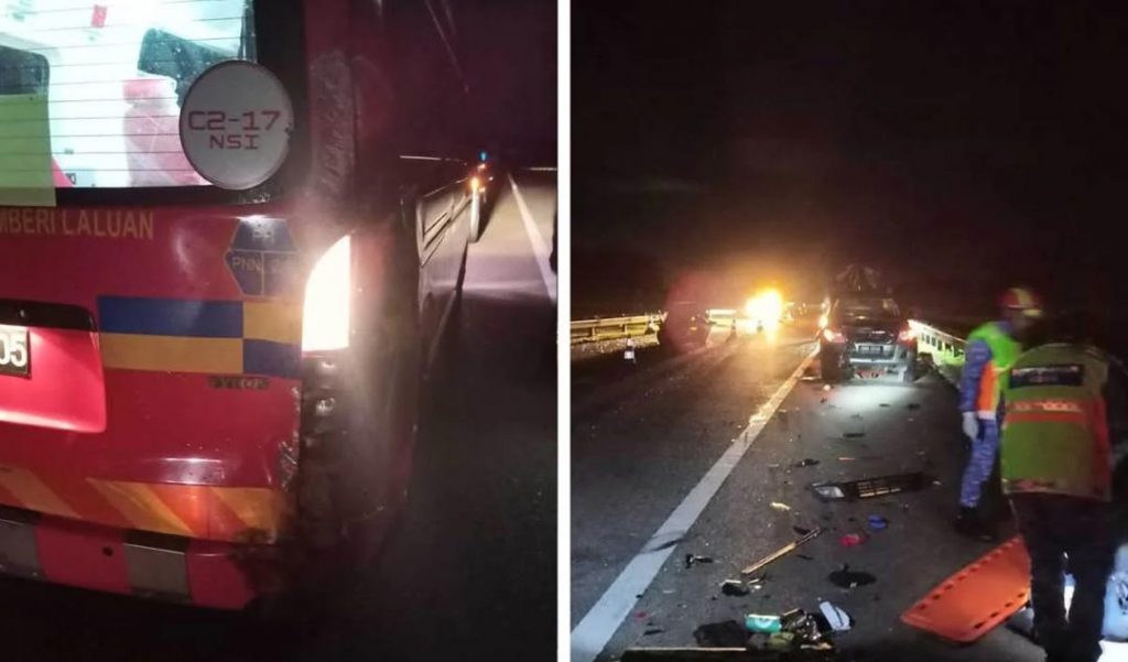 “Namun datang sebuah lagi kenderaan utiliti sukan (SUV) jenis Kia Sorento melanggar Proton Saga terbabit menyebabkannya berpusing sebelum merempuh lori serta jentera EMRS yang berada di tepi lebuh raya.