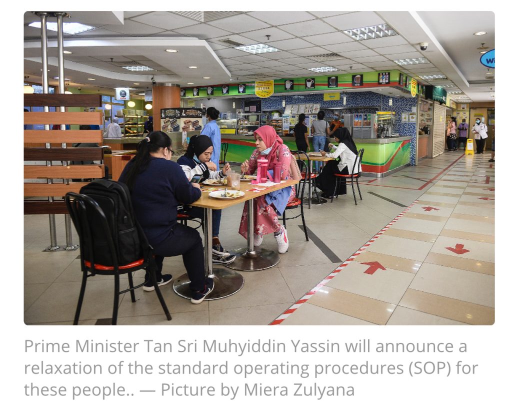 Muhyiddin said the relaxation of the SOP restrictions include travel to Malaysia, inter-state movement for spouses working separately, social activities, sports and dine-in at restaurants.