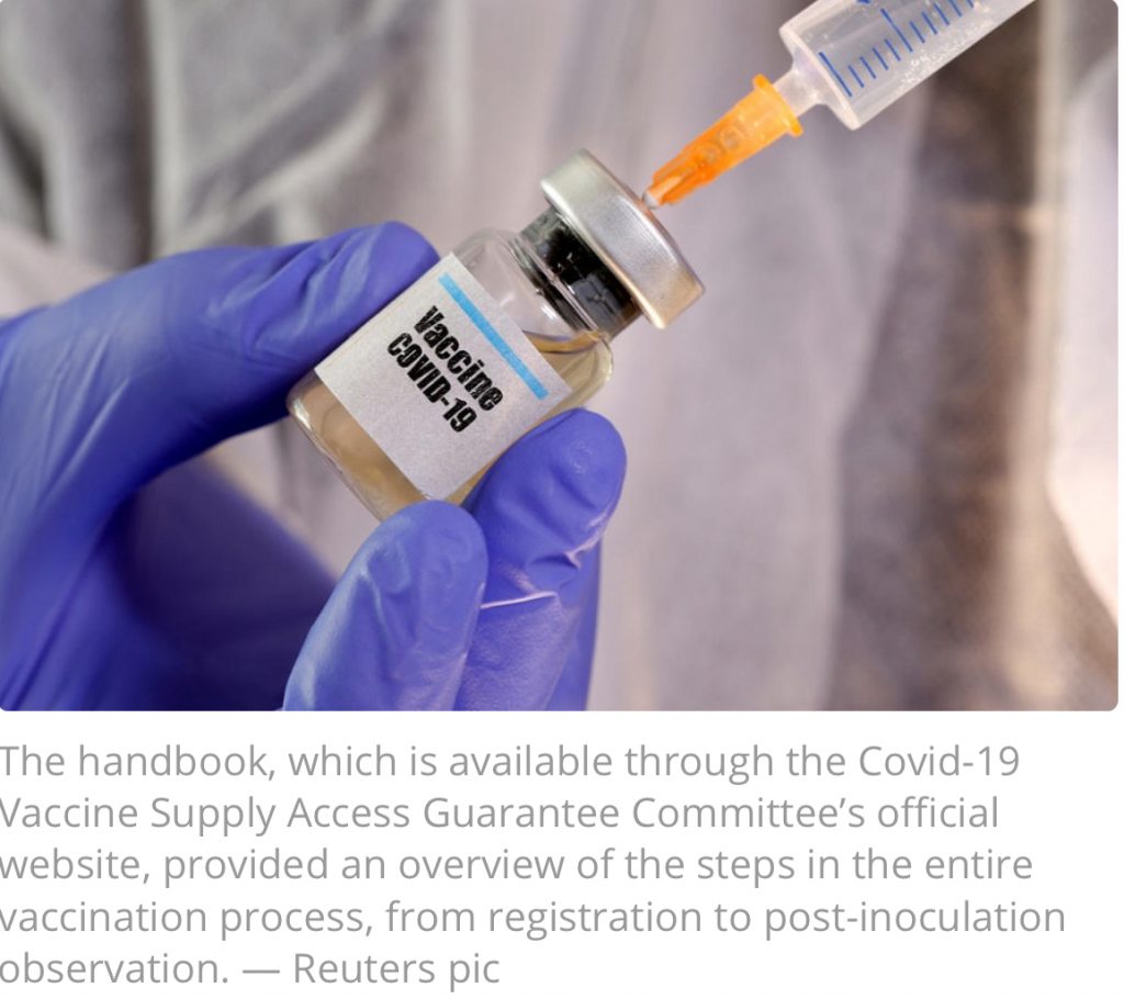 The handbook also contains the ways one can register for vaccination: through the MySejahtera application, the Vaksin Covid website, a hotline, outreach programmes, and at both private or government medical facilities.