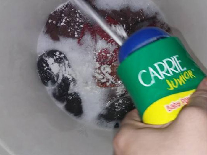 3. Setelah mesra bedak dalam material tudung, barulah cuci macam biasa. Rendam dengan sabun sekejap dan bilas.