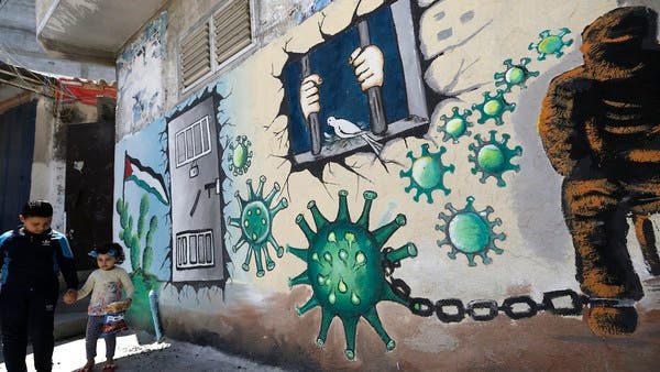 Anak-anak Palestin berjalan melintasi sebuah dinding berlukisan mural yang menggambarkan coronavirus dan sel penjara, di Kota Gaza semasa pandemik pada 28 April 2020.  (Mohammed Abed/AFP)