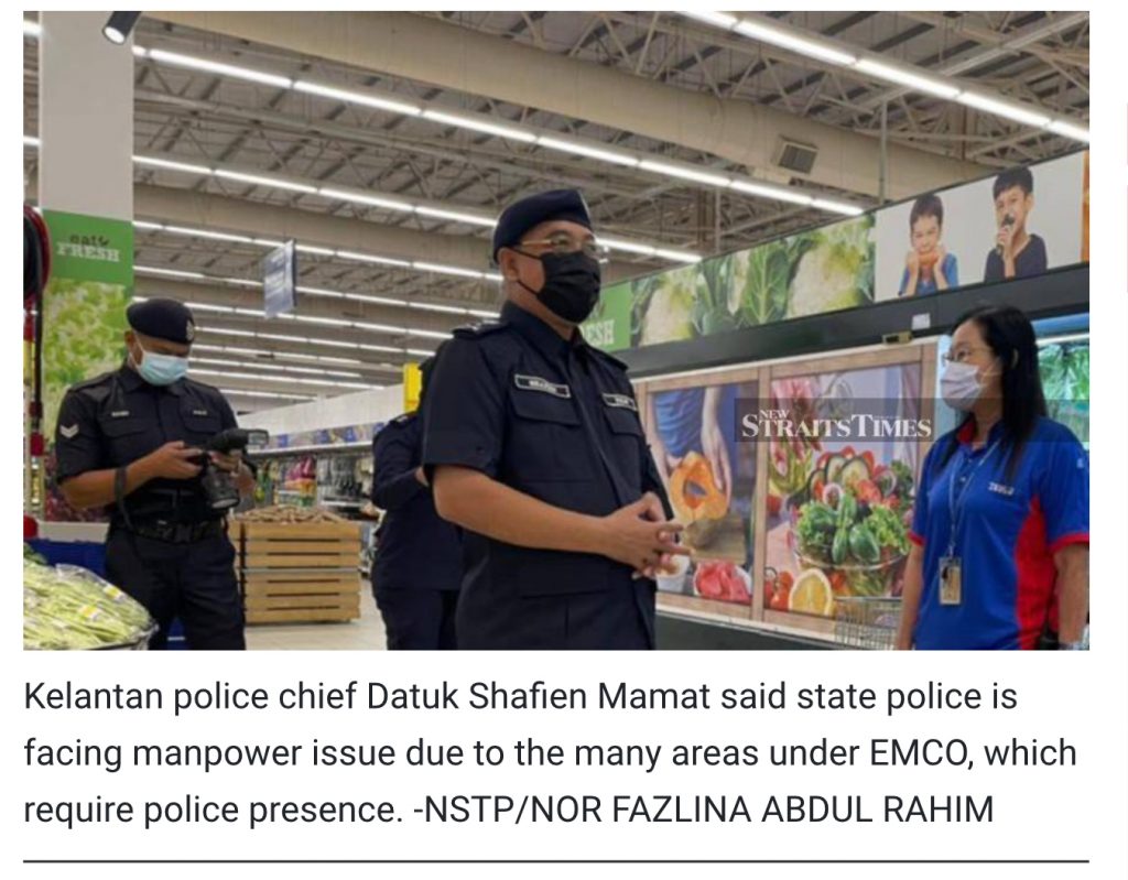 Kelantan police chief Datuk Shafien Mamat said state police is facing manpower issue due to the many areas under EMCO, which require police presence.