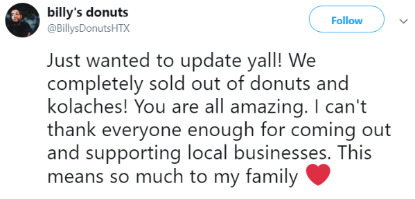Billy By, pemilik tweet tersebut tak menyangka postingnya tiba-tiba jadi viral dan ramai netizen menunjukkan support mereka dengan berkunjung ke kedai itu sehingga kesemua donut dan kolaches (sejenis manisan) habis dijual.