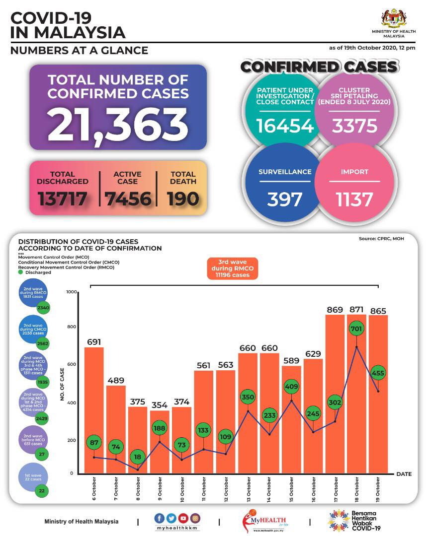 Up to19 October, Malaysia recorded 21,363 cases, 13,717 recovered cases and 190 deaths, as reported to the National Crisis Preparedness and Response Centre under the Health Ministry.
