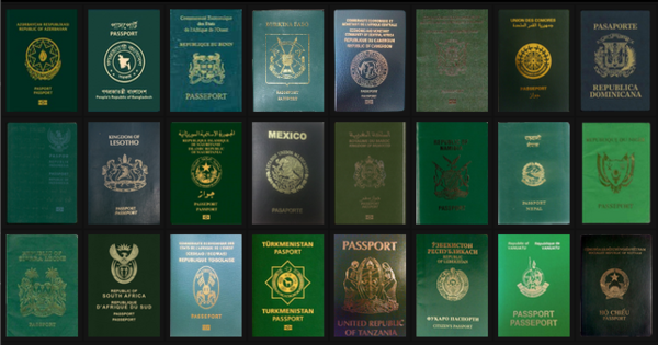 Kebanyakan negara Islam menggunakan warna hijau. Contohnya, Maghribi, Arab Saudi dan Pakistan. Warna hijau adalah bersempena dengan warna kegemaran baginda Rasulullah SAW dan menunjukkan simbol alam semulajadi dan kehidupan. Warganegara dari negara di Afrika Barat juga menggunakan passport dari kelompok warna hijau seperti Burkina Faso, Nigeria, Ivory Coast dan juga Senegal. Namun, untuk negara dari Afrika Barat ini, simbol warna hijau itu melambangkan negara mereka adalah daripada ECOWAS iaitu Komunity Ekonomi Negara-negara Afrika Barat.