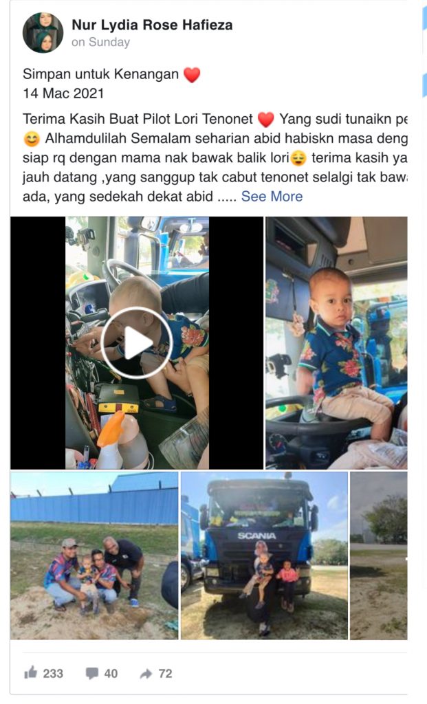 Besides that, Rose also has been receiving a lot of videos of ‘tenonet’ lorry owners from all around the country who had shared it with her for Abid on her social media platforms.
