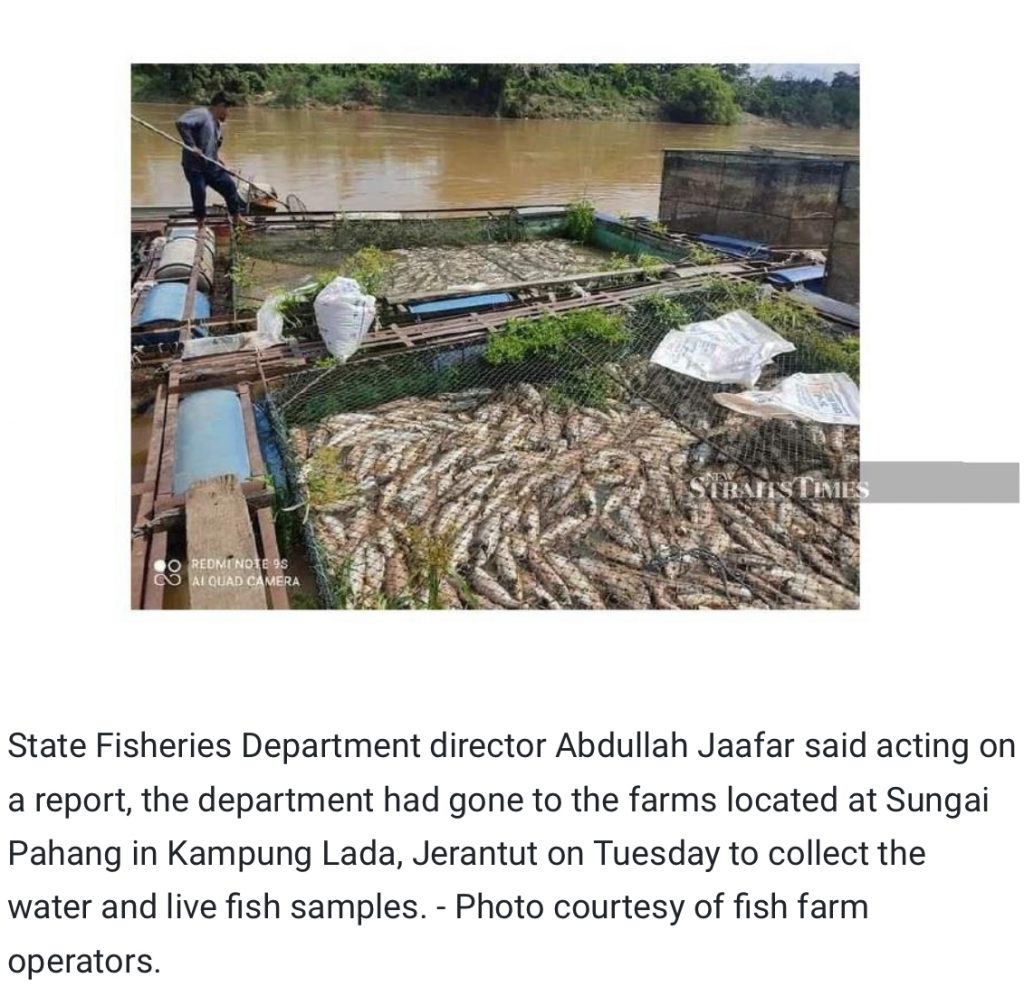 State Fisheries Department director Abdullah Jaafar said acting on a report, the department had gone to the farms located at Sungai Pahang in Kampung Lada, Jerantut on Tuesday to collect the water and live fish samples.