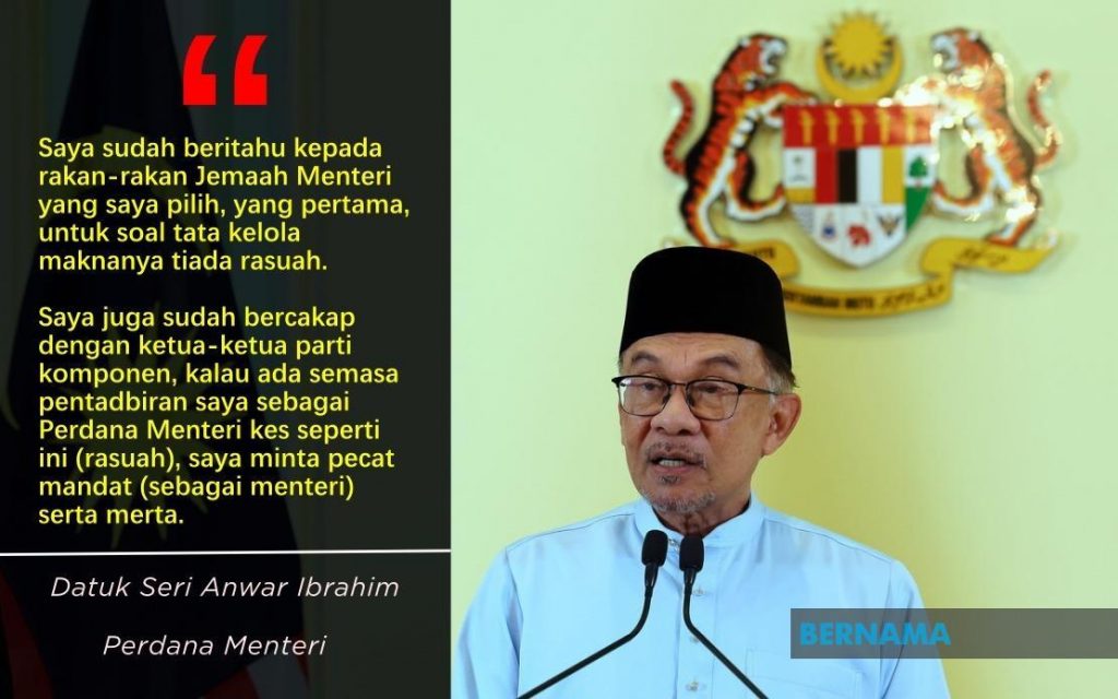 PUTRAJAYA – Mana-mana menteri di dalam Kerajaan Perpaduan yang didapati terlibat dengan budaya rasuah atau salah guna kuasa akan dipecat serta-merta, kata Perdana Menteri Datuk Seri Anwar Ibrahim.