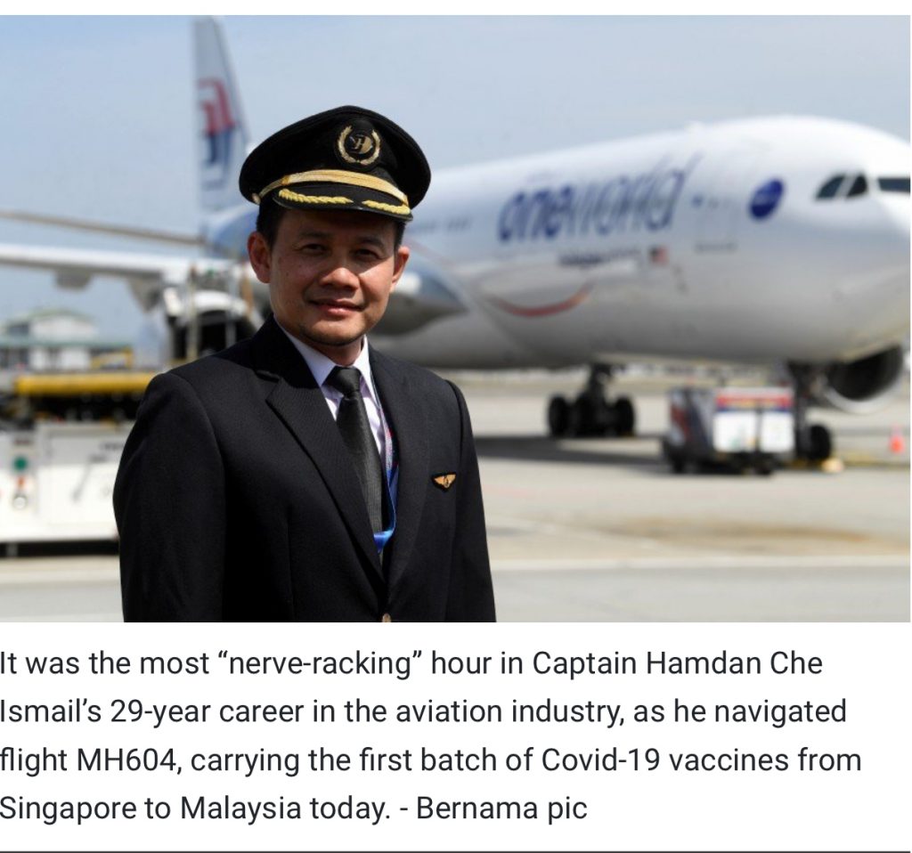“When I thought about the Covid-19 vaccine supply on the plane, I was worried that it (the supply) could get spoilt … Alhamdulillah, the vaccine supply has now reached Malaysia,” the pilot told Bernama after landing the plane.