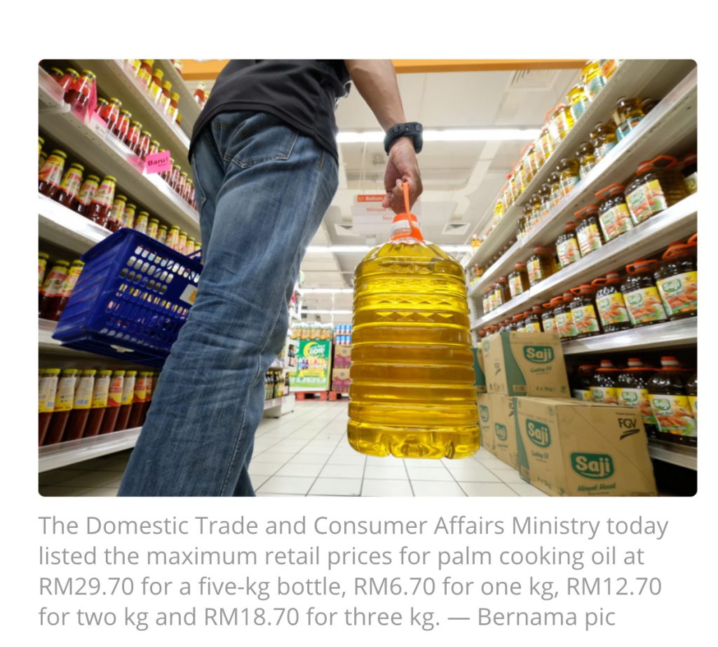 “With the implementation of price control for this cooking oil, consumers are assured of obtaining the cooking oil at under RM30 for five kg and also in other quantities regardless of the current palm oil price position,” it added.