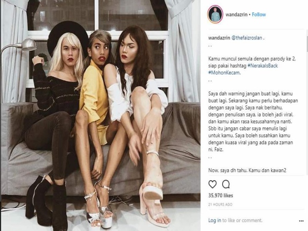 Faiz sebelum ini telah memuat naik sebuah sebuah video parodi lagu yang kini trending, Lagi Syantik dengan mengenakan pakaian wanita bersama dua lagi rakannya pada hari pertama umat Islam meyambut puasa.