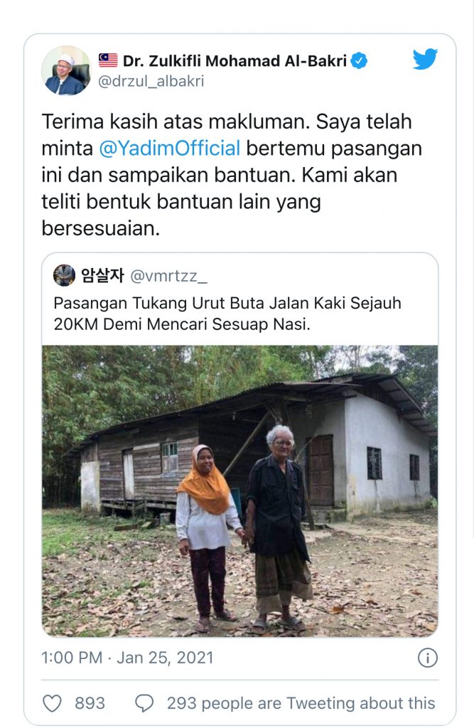 The post on Twitter has also caught the attention of many social media users including Minister in the Prime Minister’s Department (Religious Affairs) Datuk Seri Zulkifli Mohamad Al-Bakri who said that help will be channeled to the couple.