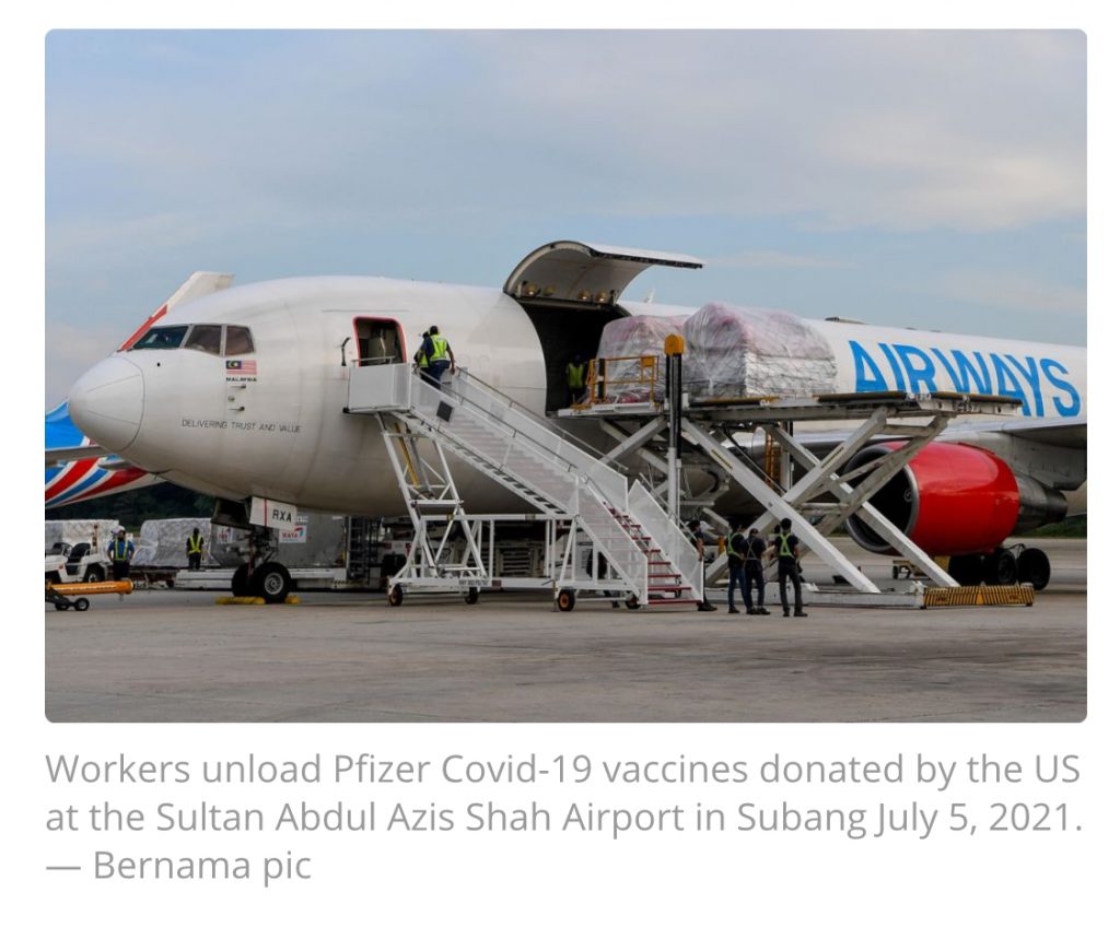 The United States (US) Embassy in a statement today said that shipment of the vaccine arrived at the Sultan Abdul Aziz Shah Airport for distribution to vaccine centres nationwide.