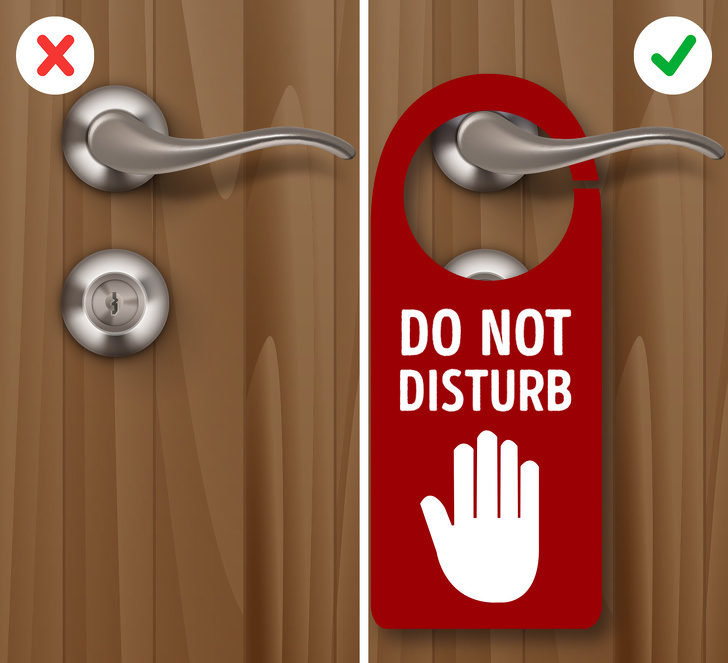Setiap kecurian yang berlaku apabila anda tiada di dalam bilik. Untuk mengelirukan pencuri, pasang TV anda di dalam bilik dan meletakkan tanda “Jangan Ganggu” ataupun “Do Not Disturb” di tombol pintu luar untuk memberi ilusi bahawa bilik itu ada orang.