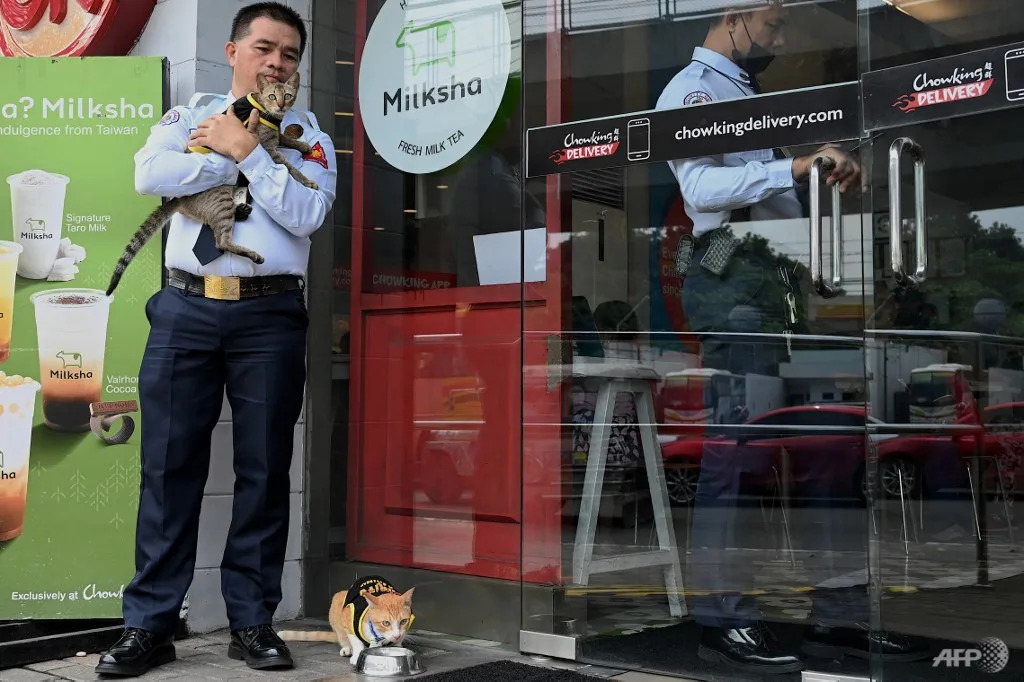 MANILA: A cat wearing a black-and-yellow security vest strolls nonchalantly past security guards lined outside a Philippine office building waiting to receive instructions for their shift.