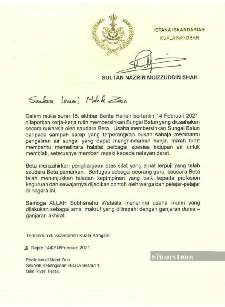The Sultan of Perak, Sultan Nazrin Shah, today praised teacher Ismail Mohd Zain for cleaning up Sungai Balun in Slim River, Tanjung Malim voluntarily.