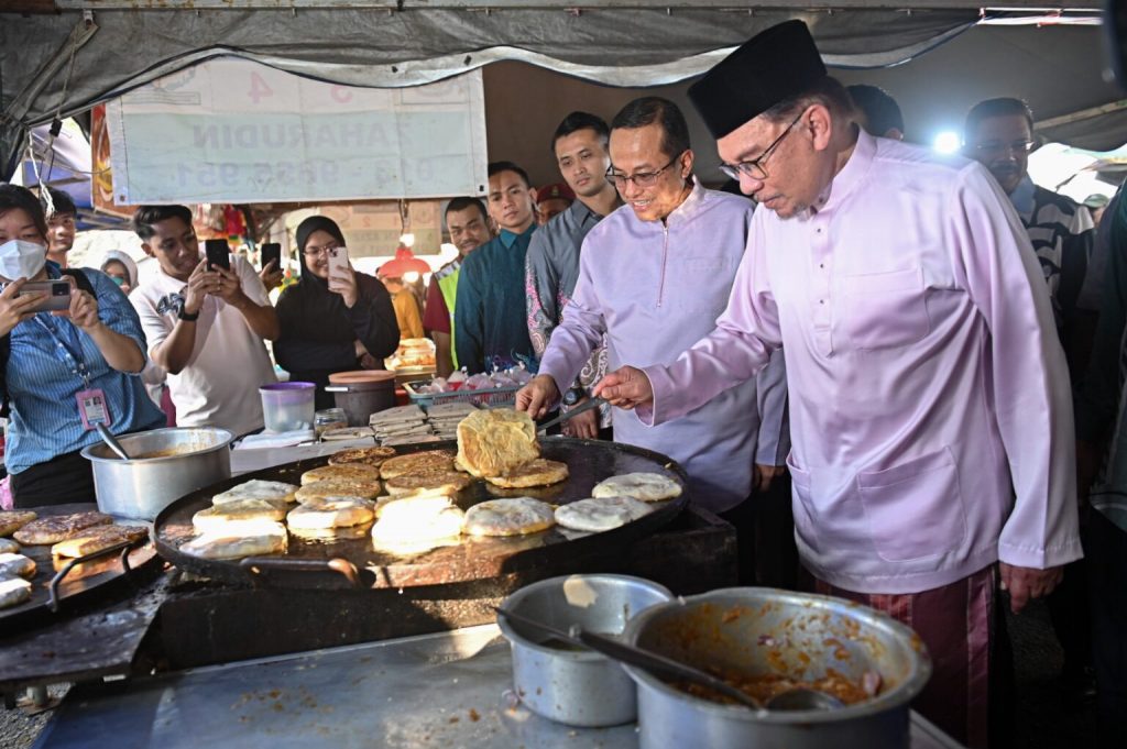 Anwar turut dilihat membeli kuih tradisional akok, selain cuba menggoreng martabak di salah sebuah gerai di bazar tersebut.