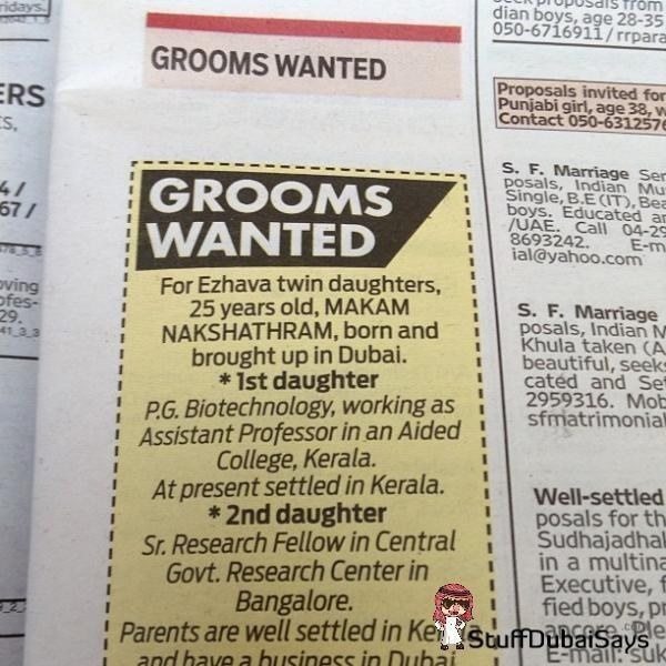 Kebiasaannya jika kita membaca akhbar, pasti terdapat ruangan mencari pekerjaan kosong yang diwarwarkan. Berbeza dengan akhbar tempatan di Dubai yang mempunyai ruangan untuk mencari jodoh. Biasanya para bapa akan mengiklankan anak perempuan mereka untuk dikahwinkan namun melihat pada kriteria dan latar belakang pendidikan serta kekayaan keluarga membuatkan ia seperti sesuatu yang sukar namun bukanlah mustahil. Jika berminat, anda boleh mencuba nasib anda di sana.