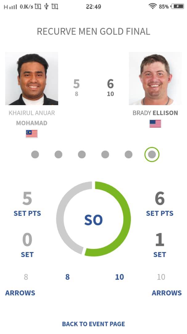 Tewas di tangan pemanah dari Amerika Syarikat, Brady Ellison, di set penentuan ‘shoot-off’ dengan mata 10-8, perlawanan pada mulanya dilihat sengit apabila kedua-duanya mengikat kedudukan 5-5 di set kelima.