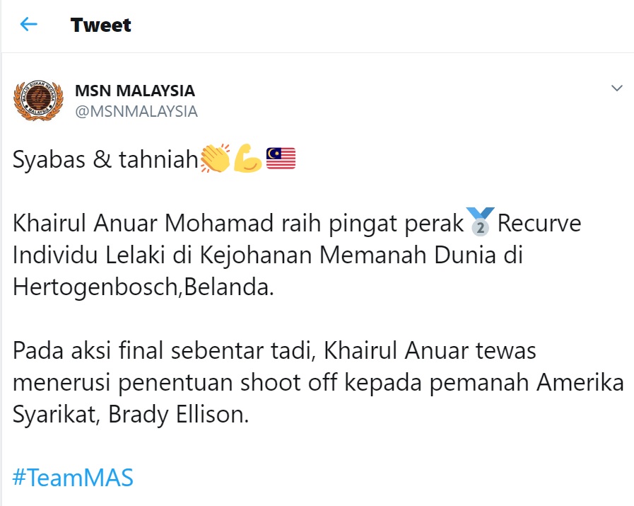 Dalam pada itu, Majlis Sukan Negara Malaysia, menerusi laman rasmi Twitter, turut memuat naik ucapan syabas dan tahniah kepada pemanah negara itu.