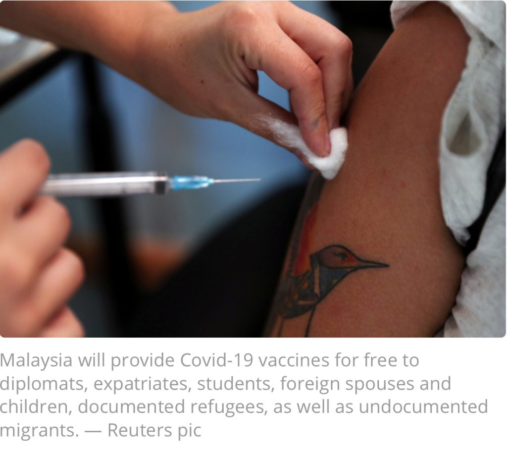 Putrajaya today announced that all foreign nationals living in Malaysia will be able to get vaccinated against Covid-19 for free, including undocumented migrants.