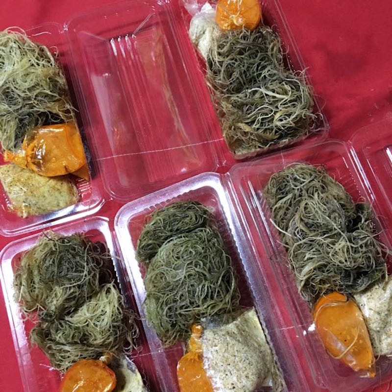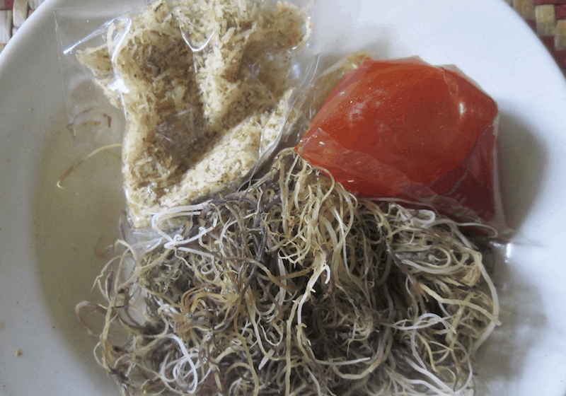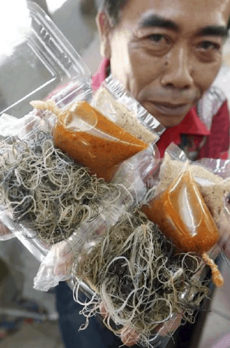 Kepada mereka yang tidak mengenali makanan eksotik tersebut, ia adalah sejenis makanan rumpai laut dan dihidangkan bersama kelapa goreng, isi ikan, serta kuah yang ditumis.
