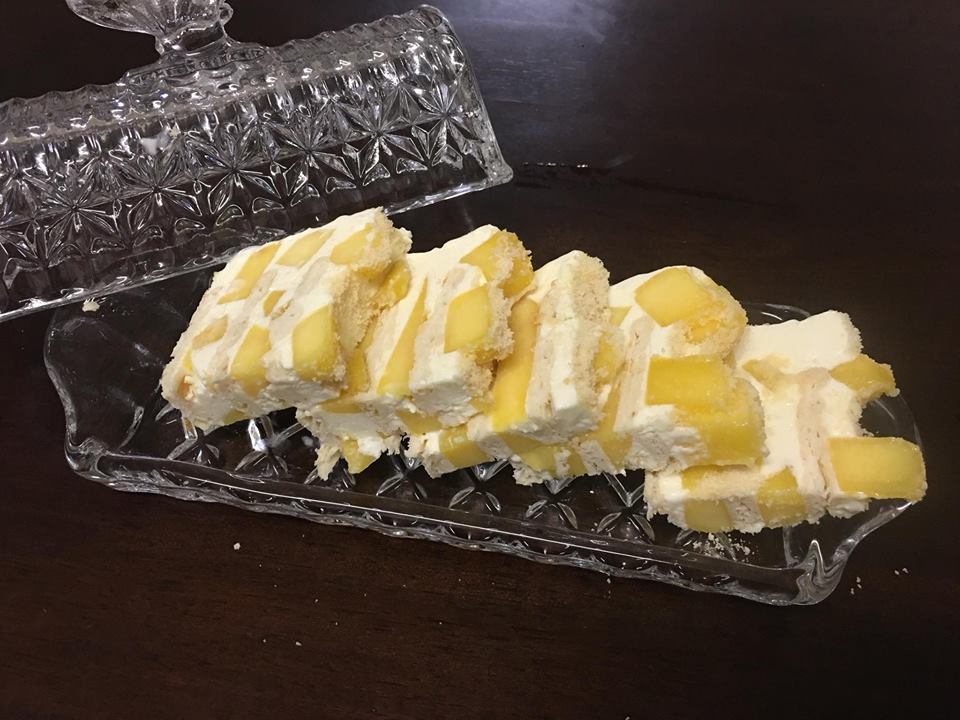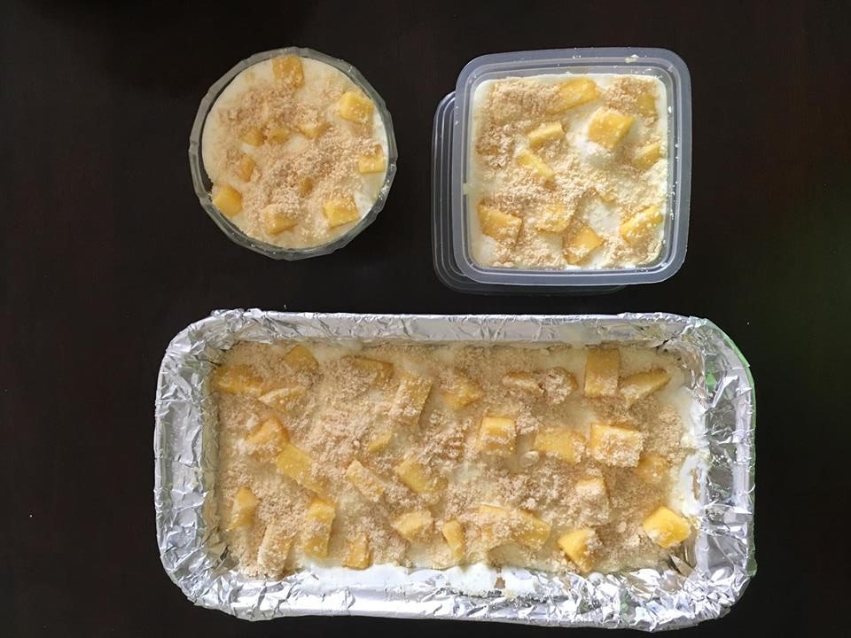 Kemudian aturkan hirisan mangga diatasnya. Ulang langkah 3-5 hingga habis.
