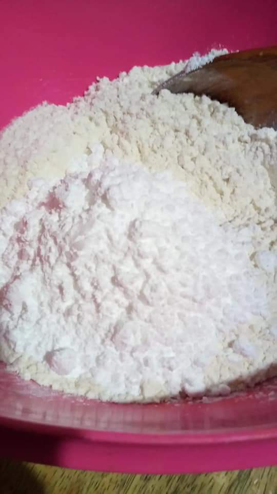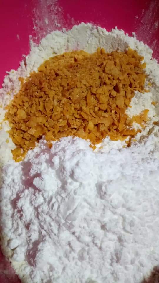 Tak payah tunggu tepung tu sejuk, boleh campur terus dengan gula kastor dan cornflakes.