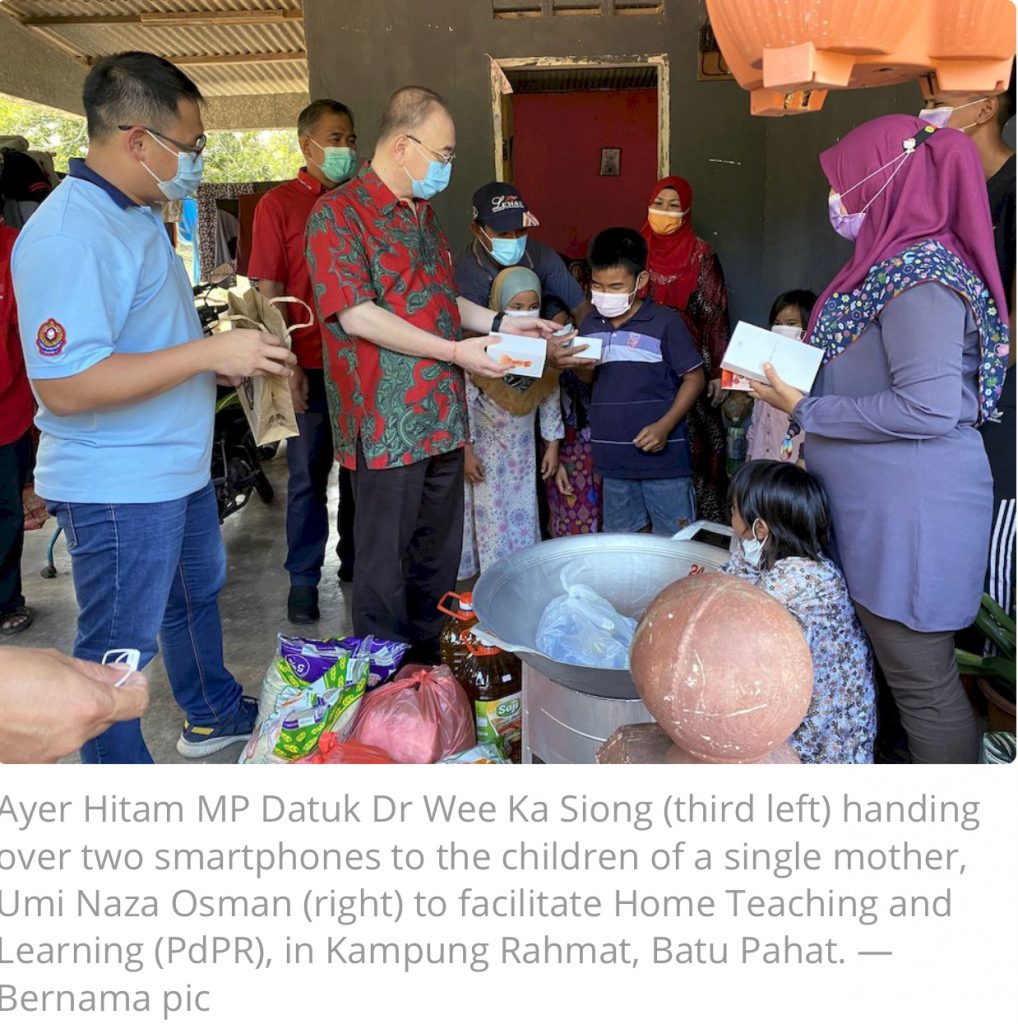 Ayer Hitam Member of Parliament Datuk Seri Dr Wee Ka Siong who met Umi at her residence today during a programme to present daily essentials to the needy in the parliamentary constituency also donated two smartphones to the family.Wee, who is also the Transport Minister, said it was hoped that the smartphones would facilitate her children’s PdPR sessions, and allow Umi to make full use of her mobile phone for her chips business. — Bernama