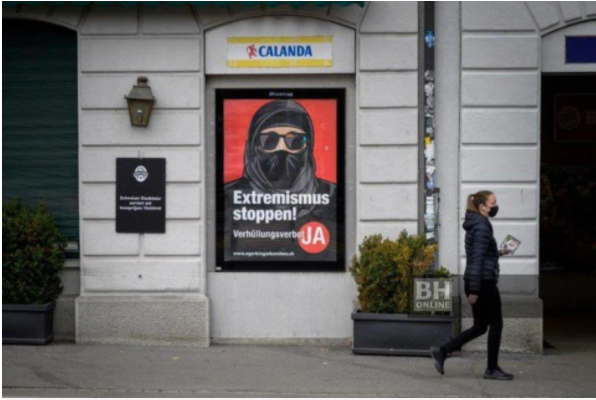 Poster kempen tertera tulisan ‘Hentikan Islam radikal!’ dan ‘Hentikan ekstremisme!’, menampilkan seorang wanita yang memakai niqab hitam dipasang di sekitar bandar-bandar Switzerland.